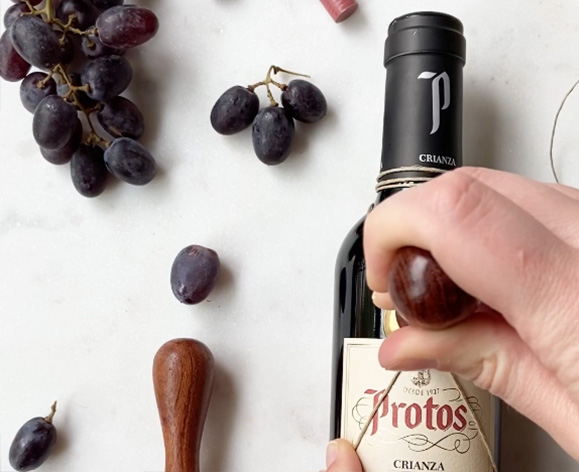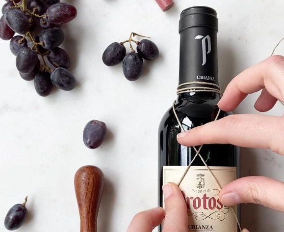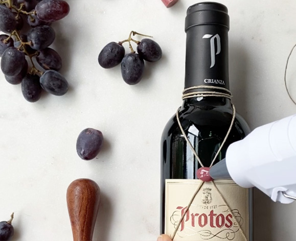 1. Con un hilo, rodeamos el cuello de la botella hasta asegurarnos de que tenga la suficiente consistencia como para no deshacerse. Cuando ya hayamos distribuido gran parte del hilo por el cuello de la botella, juntaremos ambos extremos formando una cruz sobre su cuerpo.